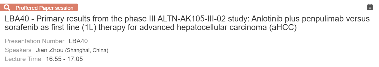 [4]Jian Z, et al. Primary results from the phase III ALTN-AK105-III-02 study: Anlotinib plus penpulimab versus sorafenib as first-line (1L) therapy for advanced hepatocellular carcinoma (aHCC). 2024 ESMO, LBA 40.