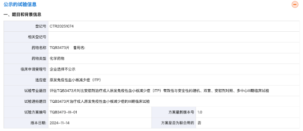 TQB3473-Ⅲ-01 是一项随机、双盲、安慰剂对照、多中心 III 期临床研究,旨在评估 TQB3473 片对比安慰剂治疗成人 ITP 的有效性与安全性。给药方案为每日一次,连续服药 24 周。